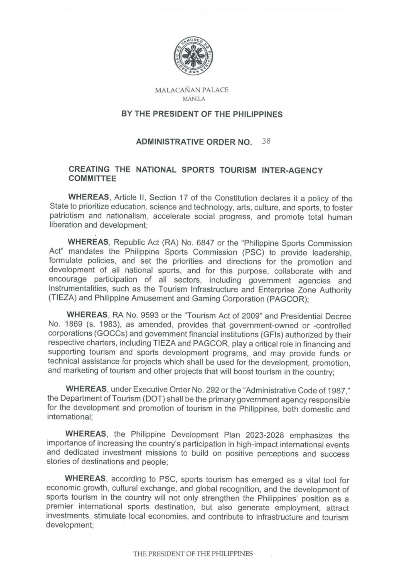 The Philippine Sports Commission (PSC) hails President Ferdinand Marcos Jr. for putting his stamp of approval on the creation of the National Sports Tourism Inter-Agency Committee (NST-IAC) through Administrative Order โ„–38.