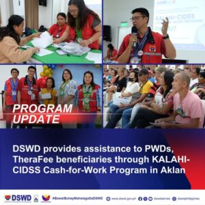 NEW WASHINGTON, Aklan- The Department of Social Welfare and Development (DSWD), through its Kapit-Bisig Laban sa Kahirapan โ Comprehensive and Integrated Delivery of Social Services (KALAHI-CIDSS) program under the Kapangyarihan at Kaunlaran sa Barangay (KKB) modality, successfully conducted a two-day Cash-for-Work Program (CFWP) TheraFee Payout Activity for Persons with Disabilities (PWDs) from June 26 to 27, 2025 at New Washington Center and Madalag Gym in Kalibo, Aklan.