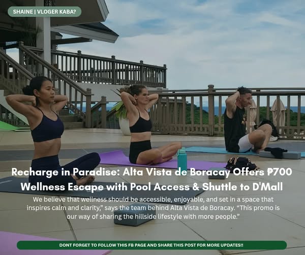 Looking for the perfect reason to unwind, move, and breathe in the beauty of Boracay? This September, Alta Vista de Boracay invites everyone to experience a refreshing wellness escape for just โฑ700 per session โ a complete package that includes Zumba or Yoga classes, swimming pool access, yoga mat use, complimentary water drinks, and a shuttle ride from the Hotel to DโMall.