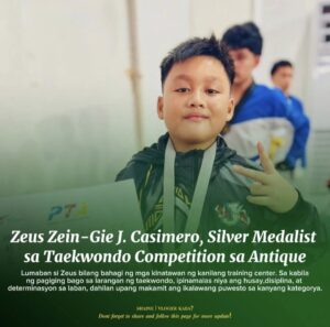 Ibajay, Aklan- Isang karangalan ang naiuwi ni Zeus Zein-Gie J. Casimero, estudyante ng Jose Doromal Taekwondo Gym โ Ibajay Branch, matapos siyang magwagi ng silver medal sa Taekwondo competition na ginanap ngayong Hulyo 19 sa Binarayan Sports Complex Gymnasium, San Jose, Antique.