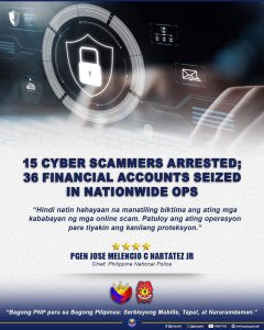 The Philippine National Police, under the leadership of PNP Chief, Police General Jose Melencio C. Nartatez Jr., successfully conducted 15 coordinated anti-cybercrime operations nationwide from April 1 to 15, 2026, resulting in the arrest of 15 individuals engaged in the illegal online sale of financial accounts, including ATM and e-wallet accounts, and the confiscation of 36 various financial accounts used in fraudulent transactions.