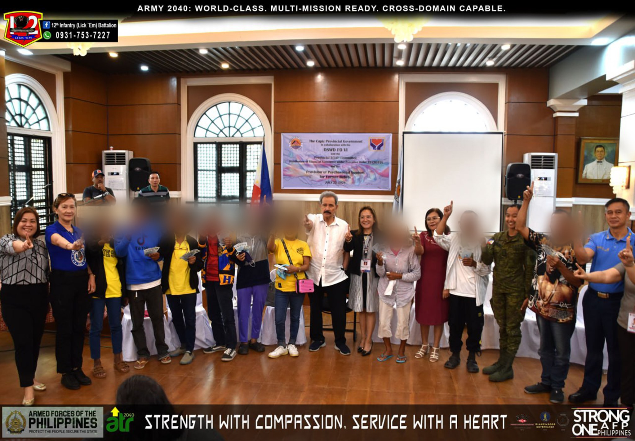 Calinog, Iloilo – The 12th Infantry (LICK ’EM) Battalion, facilitated the distribution of financial assistance under the Enhanced Comprehensive Local Integration Program (E-CLIP) to 94 Former Rebels (FRs) at Hall of Governors, Capiz Provincial Capitol, Roxas City on July 23, 2024.