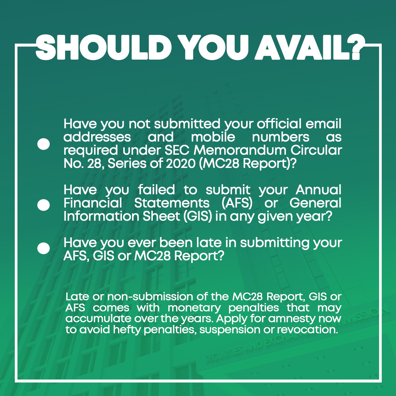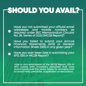 Corporations, which have failed to file its GIS, AFS and/or MC28 Report on time, in any given year, are strongly encouraged to submit their applications for the SEC Amnesty Program before the deadline on September 30, 2023.