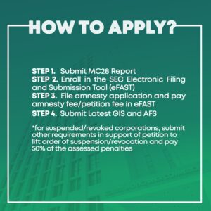 Such corporations may submit their applications through their company accounts on the SEC Electronic Filing and Submission Tool (eFAST) at efast.sec.gov.ph. Should they not have an eFAST account at this time, they must submit their MC28 Report online and enroll in eFAST, then proceed with their amnesty application. For a step-by-step guide, kindly provide the following link to the tutorial video prepared by the SEC: bit.ly/amnestystreamlined.