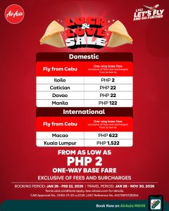 This February, as love and good fortune fill the season, AirAsia Philippines rolls out its ‘Luck and Love’ promo, offering one-way base fares from as low as ₱2 from Cebu and Manila.