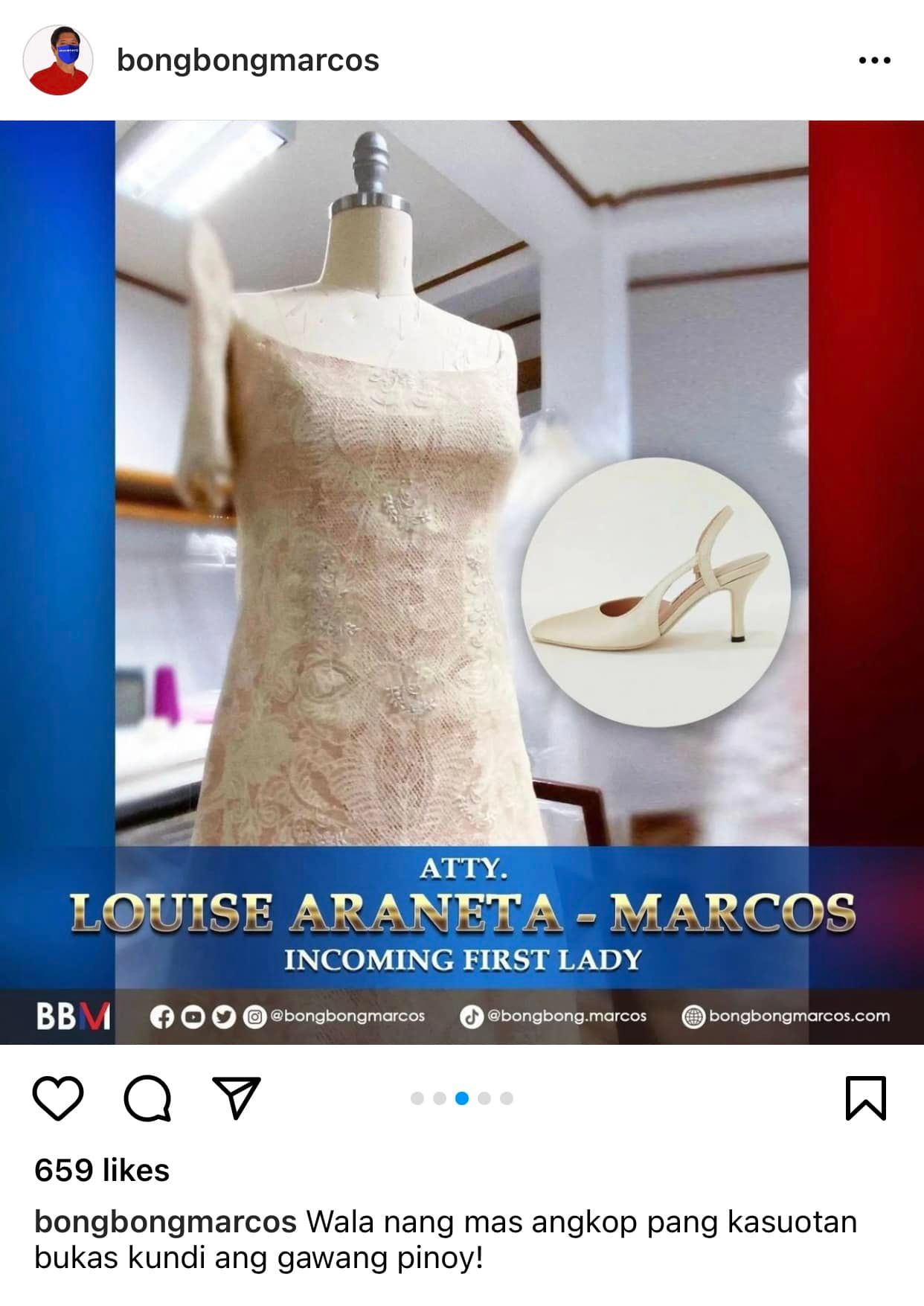 “The First Lady’s MOBO terno Piña Terno Dress. Wala ng mas angkop pang kasuotan bukas kundi ang gawang Pinoy! MOBO Piña terno para sa Unang Ginang ng Pilipinas!,” said President-elect Bongbong Marcos in his official facebook page.