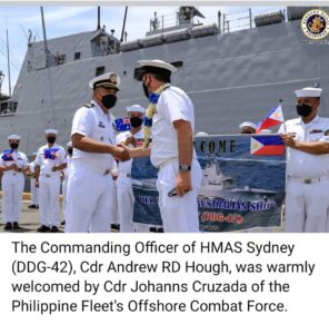 The official facebook page of the Philippine Navy recently featured a Philippine Navy (PN) contingent led by Offshore Combat Force Chief of Staff, Commander Johanns Cruzada. Cruzada accorded the visiting Australian Navy ship and its crew members headed by their Commanding Officer, Commander Andrew Hough a welcome ceremony upon arrival at the port.