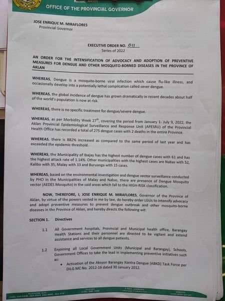 In a two-page Executive Order No. 11 released Monday, Governor Jose Enrique Miraflores said preventive measures against dengue and other similar diseases. According to the Provincial Epidemiological Surveillance and Response Unit (APESRU) of the Provincial Health Office, Aklan has registered 275 dengue cases so far this year.
