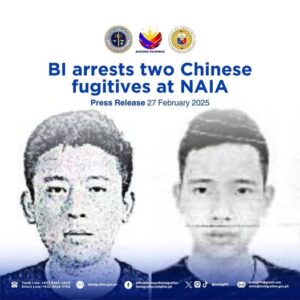 Bureau of Immigration (BI) officers at the Ninoy Aquino International Airport (NAIA) arrested two Chinese fugitives wanted by the BI and Interpol who attempted to flee the country for Malaysia.