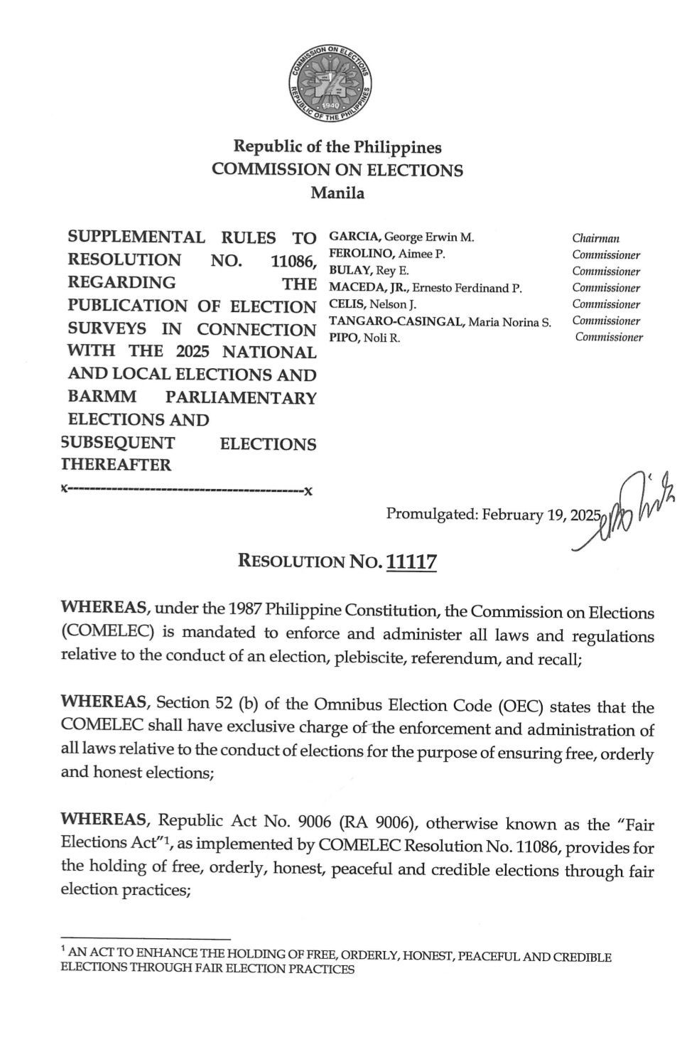 To reinforce responsible polling practices, the Commission on Elections (COMELEC) issued Resolution No. 11117 in February 2025, stating that only pre-registered and accredited organizations are allowed to conduct and release election surveys to the public. This regulation ensures that only legitimate survey firms, using credible methods, engage in public polling activities during the election period.