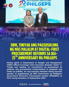 Ito ang kanyang mensahe bilang keynote speaker sa pagdiriwang ng 25th Anniversary ng Philippine Government Electronic Procurement System (PhilGEPS) sa PICC noong Huwebes, 21 Nobyembre 2025.