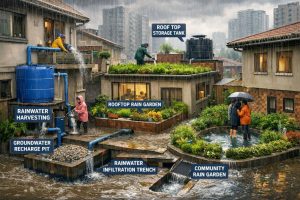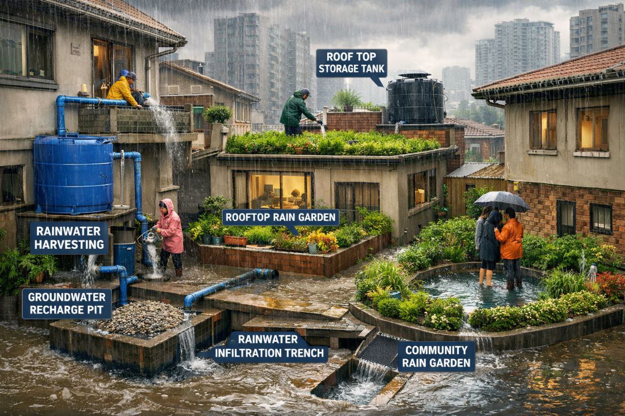 This simple cycle not only conserves water during dry spells but actively keeps hundreds of liters of water out of the drainage system during every heavy downpour.