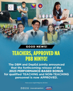 MANILA – The Department of Budget and Management and the Department of Education have jointly announced the approval and forthcoming release of the 2023 Performance-Based Bonus for qualified teaching and non-teaching personnel.