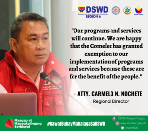 “Our programs and services will continue. We are happy that the Comelec has granted exemption to our implementation of programs and services because these are for the benefit of the people,” said Atty. Carmelo Nochete, regional director of DSWD FO VI.