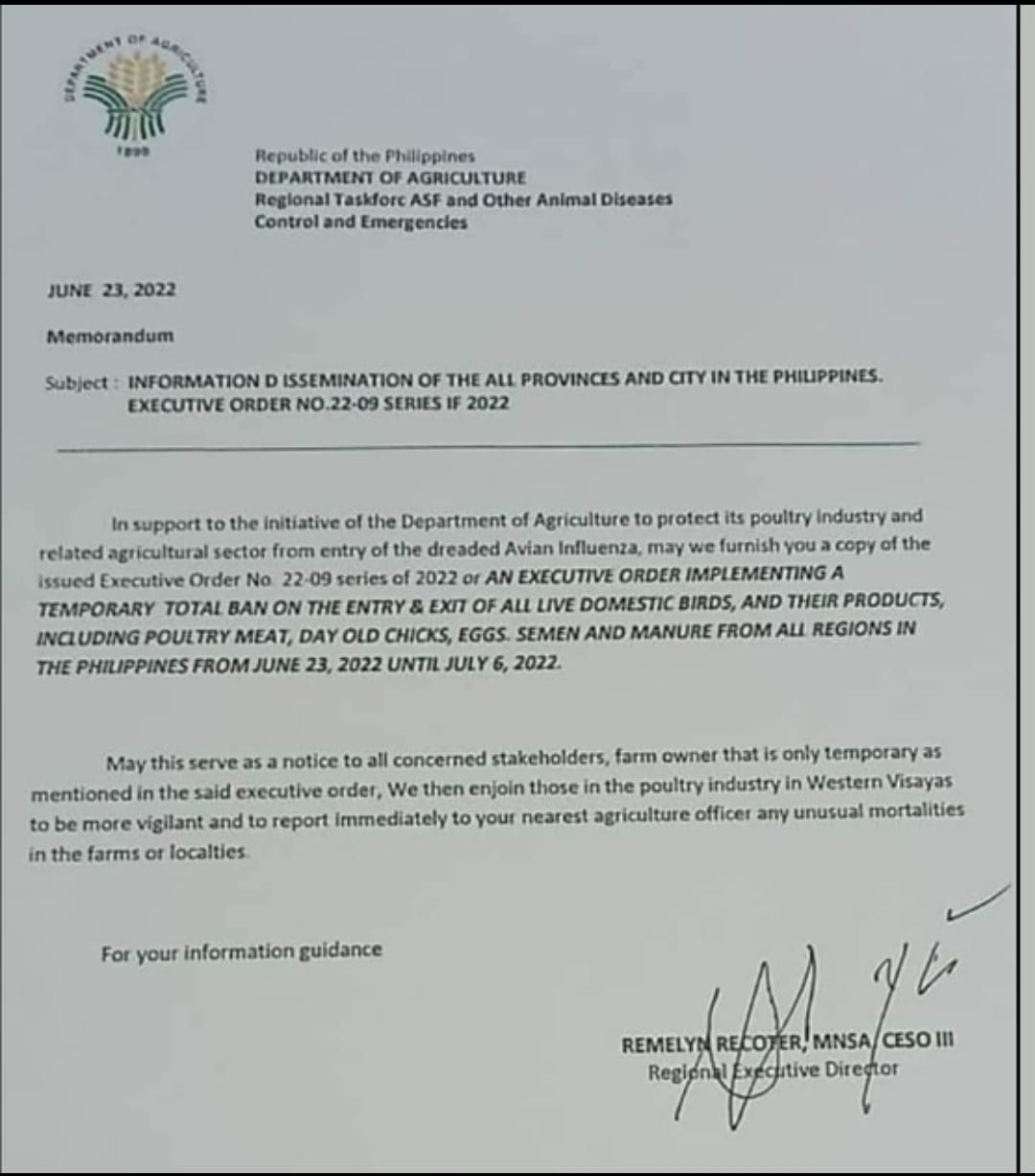 The said memorandum was supposedly a reminder of an executive order implementing a temporary total ban on the entry and exit of all live domestic birds, and their products including poultry meat, day old chicks, eggs, semen and manure from all regions in the Philippines.