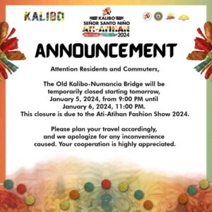 “Attention Residents and Commuters.The Old Kalibo-Numancia Bridge will be temporarily closed starting tomorrow, January 5, 2024, from 9:00 PM until January 6, 2024, 11:00 PM. This closure is due to the Ati-Atihan Fashion Show 2024. Please plan your travel accordingly, and we apologize for any inconvenience caused. Your cooperation is highly appreciated,” the KAFEB said.