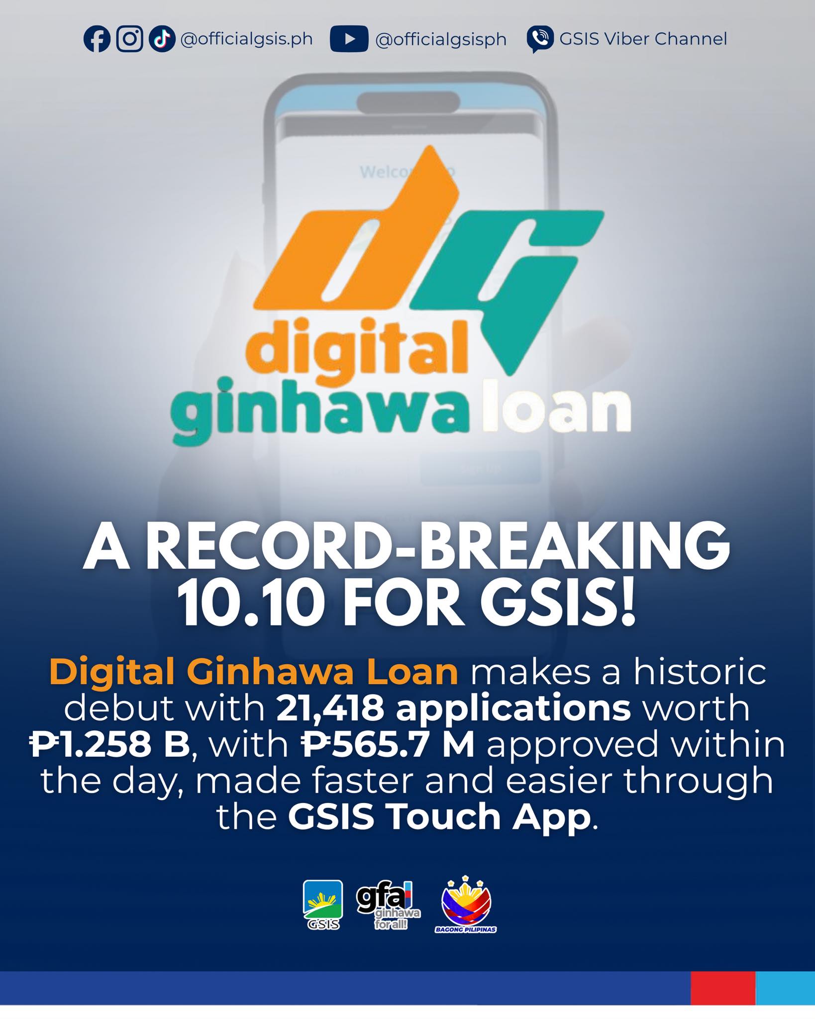 The Government Service Insurance System (GSIS) received an overwhelming response from government employees on the first day of the Digital Ginhawa Loan launch on October 10, with 21,418 applications totaling ₱1.258 billion filed through the GSIS Touch mobile app.