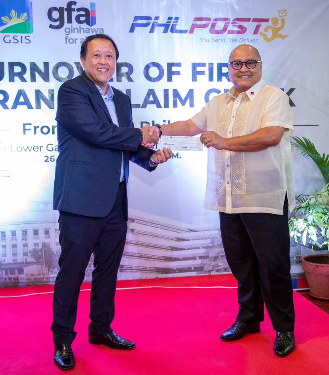 The check was presented by the GSIS President and General Manager Wick Veloso to PhilPost Acting Postmaster General and CEO Luis D. Carlos at the GSIS Head Office in Pasay City on Wednesday.
