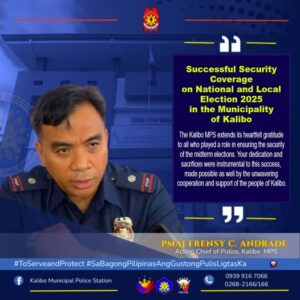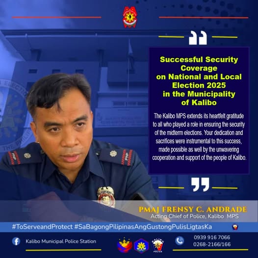 Kalibo, Aklan โ€” The Kalibo Municipal Police Station, under the leadership of PMAJ FRENSY C ANDRADE, Acting Chief of Police, extends its heartfelt gratitude to all individuals and agencies who contributed to the safe and orderly conduct of the midterm elections held from May 7 to 12, 2025.
