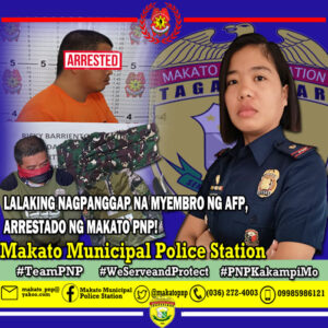 A telephone call was received 6:38 in the morning from a concerned citizen that a vehicular accident transpired at the intersection of the National Highway of Makato and Diversion Road going to Lezo. Immediately, personnel of this station responded to the area of accident. Upon arrival, the suspect approached and introduced himself as CPL RICKY BARRIENTOS, assigned at 2nd Division, 59IB of the Philippine Army, while illegally wearing an upper FSU of the PNP.
