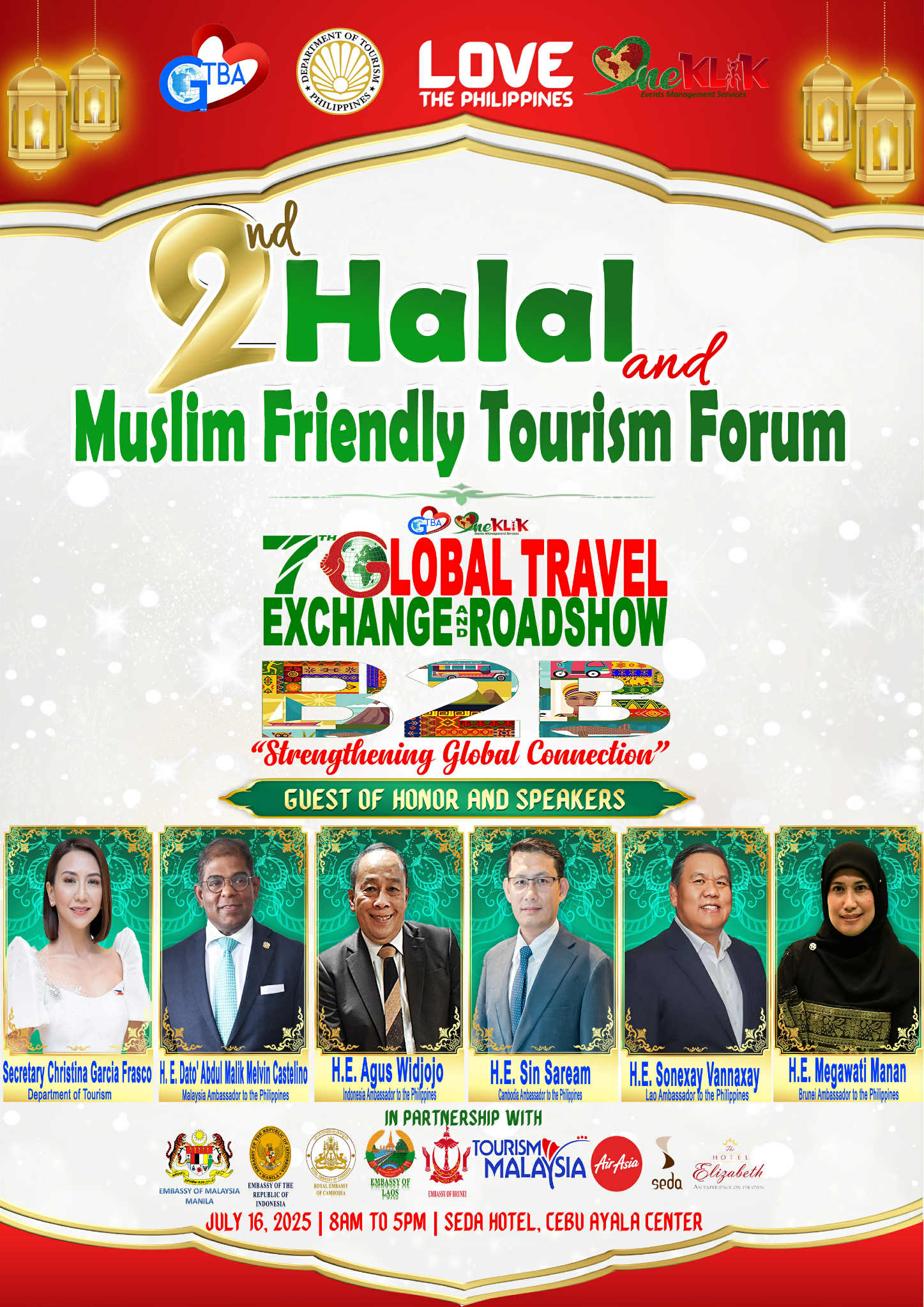 Cebu City- The Global Tourism Business Association (GTBA) is once again setting the stage for dialogue and partnerships as it holds its 2nd Halal and Muslim-Friendly Tourism Forum in Cebu on July 16, 2025 with guest of honor and speakers DOT Secretary Christina Garcia Frasco, Malaysia Ambassador H.E. Malik Melvin Castelino, Indonesia Ambassador H.E. Agus Widjojo, Brunei Ambassador H.E. Megawati Manan, Cambodia Ambassador H.E. Sin Saream and Laos Ambassador H.E. Sonexay Vannaxay. The forum is in conjunction with the 7th Global Travel Exchange and Roadshow B2B, supported and is co-presented by the Department of Tourism.