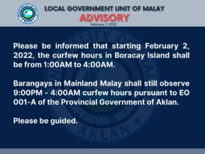 Miraflores placed mainland Aklan under curfew from 9 pm to 4 am but gave Malay town, which includes Boracay, discretion to set curfew hours on the island.