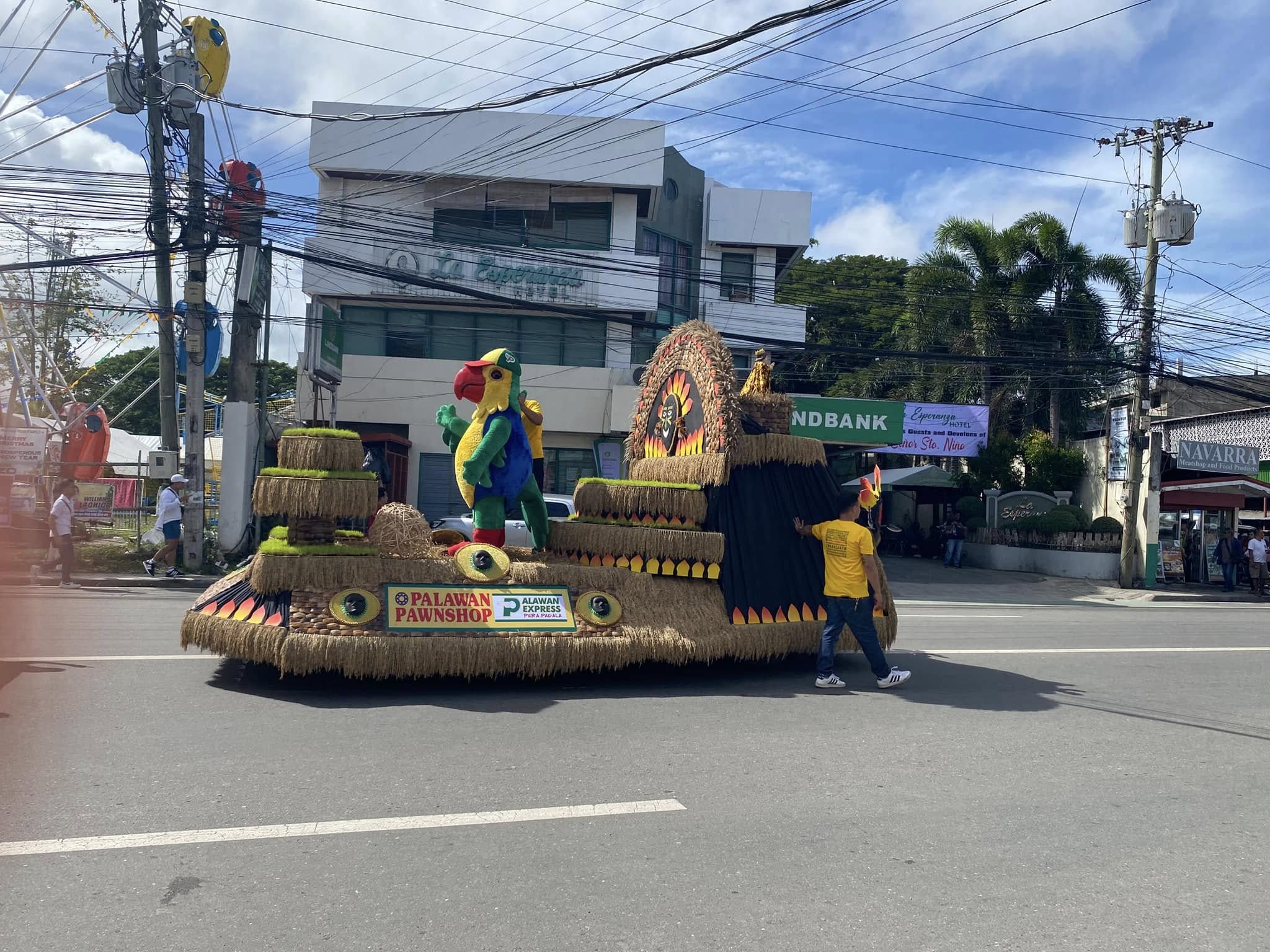 The float highlights the native design, suggesting environmental conservation. ‘Pikoy, the Palawan Pawnshop’s famous mascot, was seen atop the float during the parade tilt.
