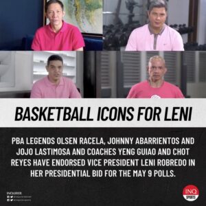 Sa isang video kasama ang beteranong PBA coach na si Yeng Guiao, nagdeklara ng buong suporta kay Robredo sina Jojo Lastimosa, Olsen Racela at Johnny Abarrientos.