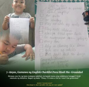 Ginawa raw ito ng bata matapos sabihan na bawal muna ang cellphone hangga’t hindi natututo ng disiplina. Sagot ng bata: “Okay, I’ll make a list so I won’t be grounded.”
