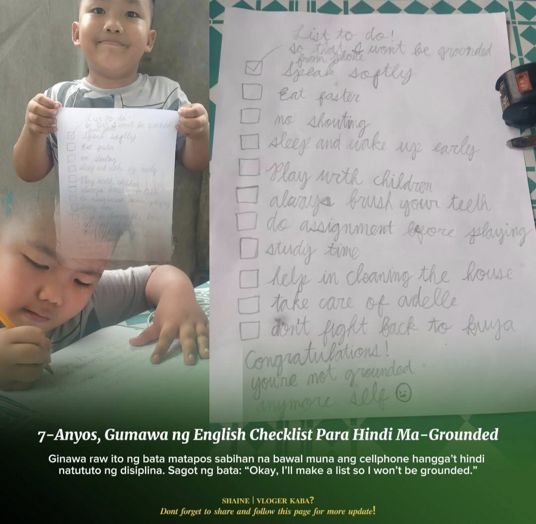 Ibajay, Aklan-Isang 7-taong gulang na bata ang gumawa ng sariling “Things To Do” checklist — at naka-English pa — para hindi siya ma-grounded sa paggamit ng cellphone. Nangyari eto sa Barangay Maloco, Ibajay Aklan.