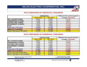 Sa inilabas na bagong power rate ng AKELCO ay makikita ang patuloy na pagbaba ng kanilang singil sa kuryete ngayong buwan ng Abril kung ikumpara noong Marso.
