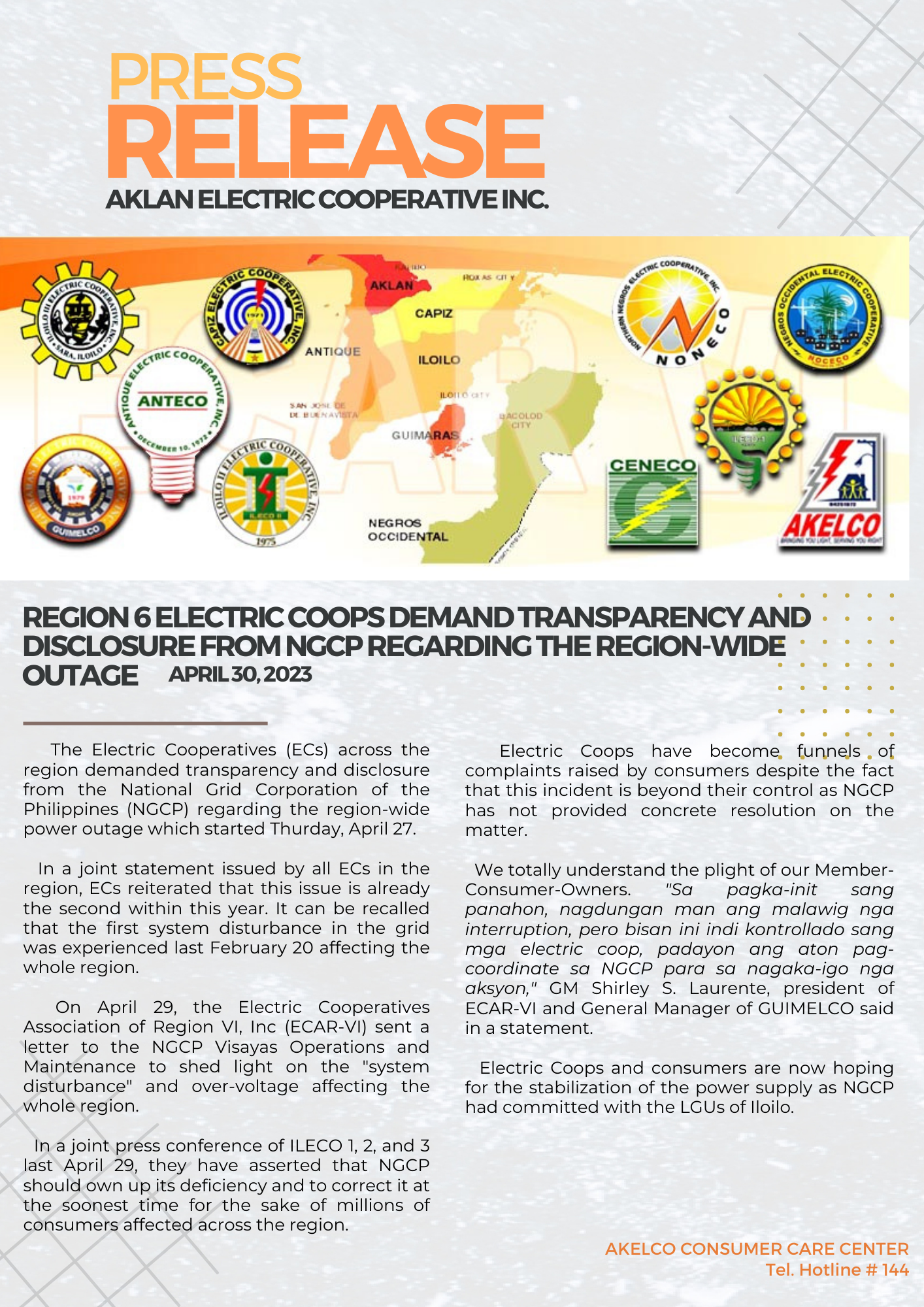 LEZO, Aklan- The Electric Cooperatives (ECs) across the region demanded transparency and disclosure from the National Grid Corporation of the Philippines (NGCP) regarding the region-wide power outage which started Thurday, April 27.