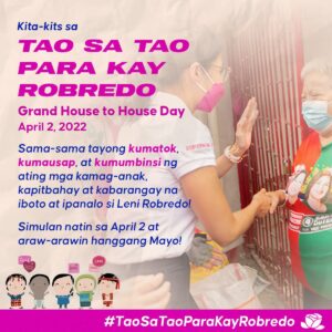 In a bid to further drum up support for her presidential bid, Vice President Leni Robredo’s family and celebrity supporters will lead a Grand House-to-House campaign in various parts of the country on Saturday (April 2).