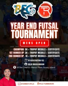 Boracay Island- Tourism sports advocate Rylo ‘Starboy’ Tumbukon is holding a year-end futsal tournament Men open tournament in Boracay. This event is in cooperation with the Boracay Football Club (BFC).