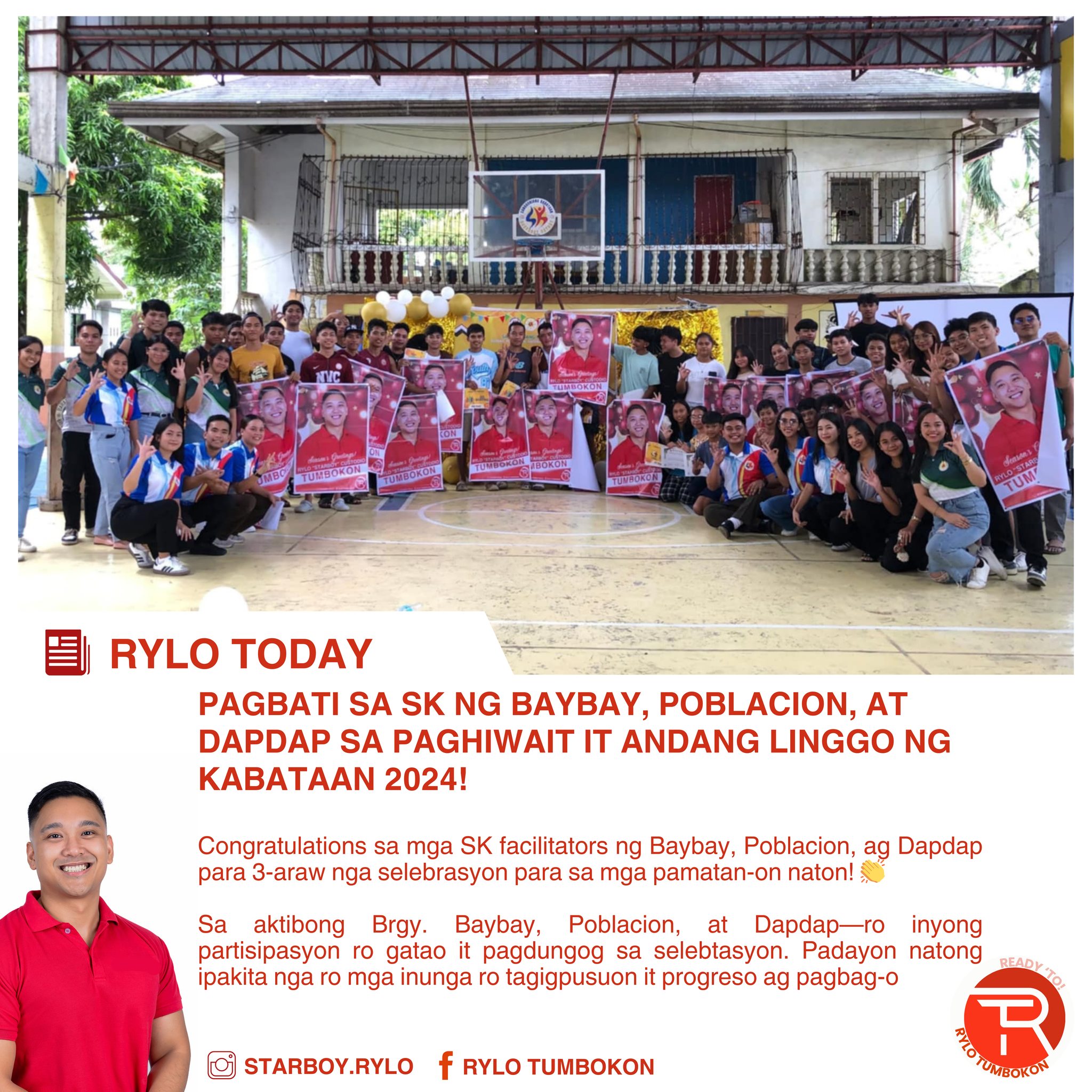 “Pagbati sa mga SK facilitators ng Baybay, Poblacion at Dapdap para sa tatlong araw na selebrasyon para sa ating mga kabataan. Ro inyong partisipasyon ro gatao it pagdungog sa selebrasyon. Padayon natong ipakita nga ro mga inunga ro tagipusuon it progreso ag pagbag-o,” pahayag ni Tumbukon.