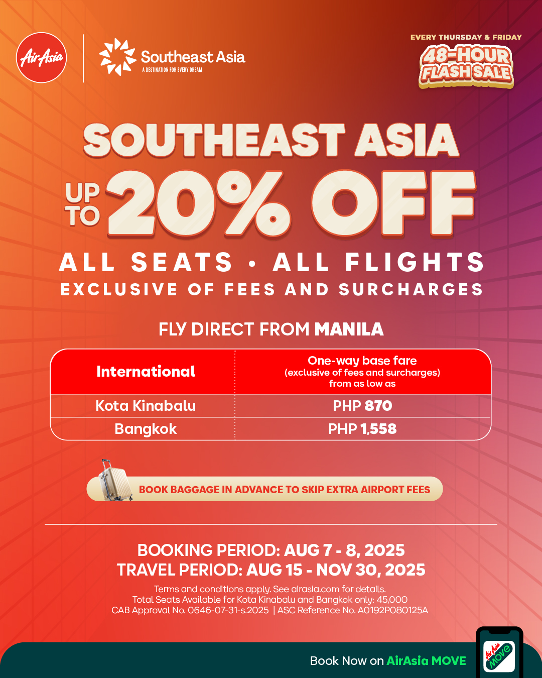 This time, AirAsia is giving guests options to explore exciting international destinations, especially within our ASEAN neighborhood, with base fares to Bangkok and Kota Kinabalu starting at just Php 870 one-way. A total of 45,000 seats are up for grabs, allowing more Filipinos to experience the vibrant cultures, delicious cuisine, and thrilling adventures Southeast Asia has to offer.