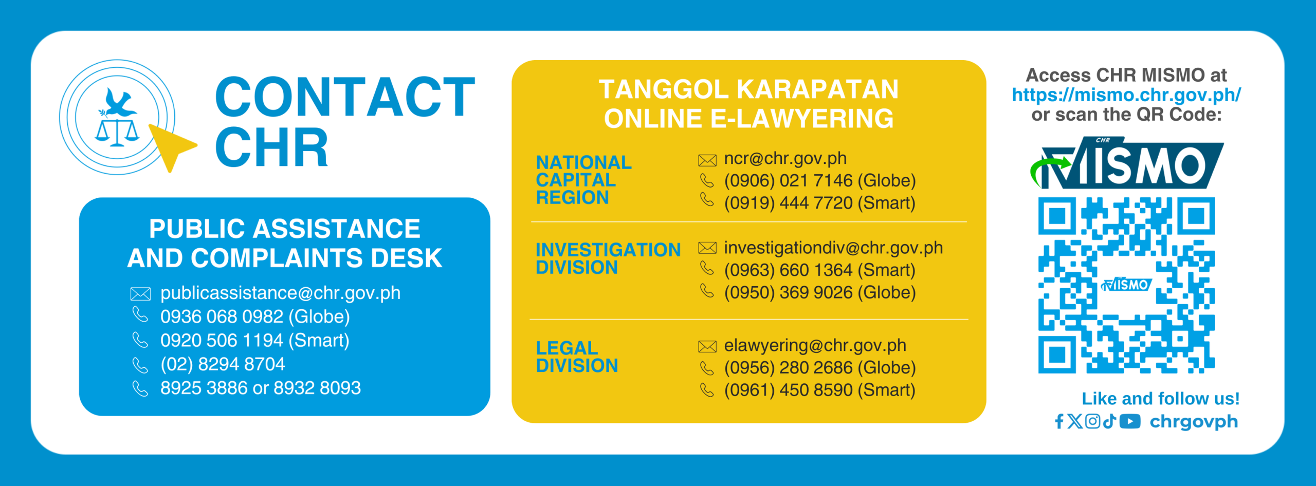 Further, the CHR is concerned about reports that, due to the incident, over a hundred families were displaced. The Commission calls on authorities to ensure adequate humanitarian assistance, protection from further displacement, and access to basic services, in line with human rights and humanitarian standards.