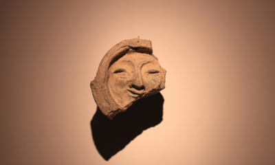 (Photo: Front view of the โSmile of Silla,โ a human-face tile from the Silla period at the National Gyeongju Museum. This timeless design inspired the APEC...