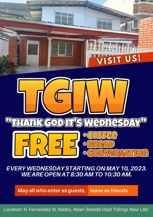 Thank God It’s Wednesday (TGIW) is a project cum support group whose visionary is Bishop Roberto M. Labor of Glad Tidings New Life Kalibo. The vision was given hands and feet by Pastor Edwin Radones, Pastor Myrl Labor-Radones and their team. The main purpose of TGIW is to make people aware that there is a safe space for them to go to should they feel the need to talk about their difficulties, to seek spiritual healing, to ask to be prayed over for a desire or dream, and even to meditate by themselves—without judgment or pressure. The place is referred to as the ‘life house’ beside Aklan Inter Faith Academy and is open from 8:30AM to 10:30AM, and the volunteer group offers free bread and free coffee to anybody who comes.