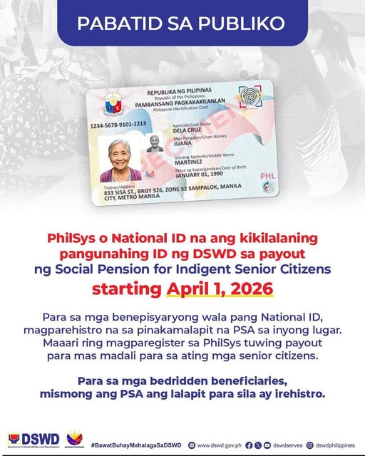 Simula Abril 1, 2026, ang Philippine Identification System (PhilSys) o National ID na ang kikilalaning pangunahing ID ng DSWD sa payout ng Social Pension for Indigent Senior Citizens.