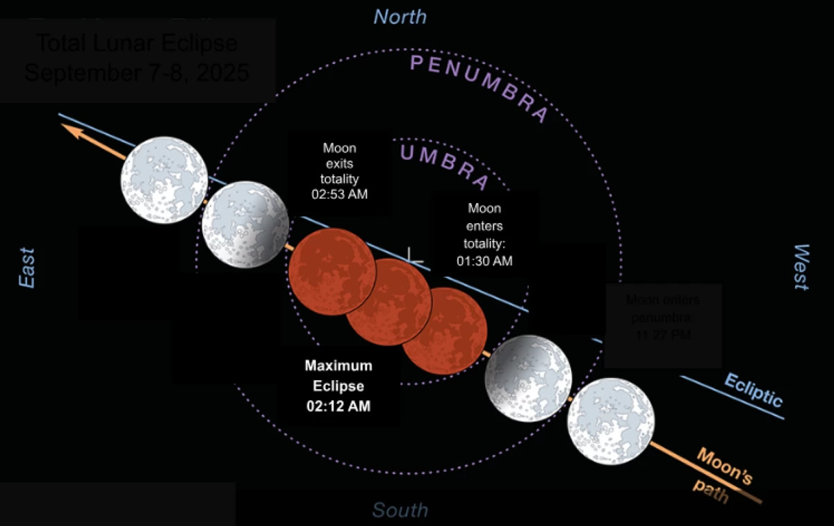 Weather permitting, the public is encouraged to observe the Moon directly overhead in the late evening of September 7, 2025, and early morning of September 8, 2025. As seen in Figure 1, the Penumbral Phase will begin at 11:27 PM on September 7, 2025, followed by the Partial Lunar Eclipse Phase that will start after midnight at 12:27 AM. The Moon Enters Totality at 1:30 AM, and the Maximum Eclipse occurs at 2:12 AM. The Partial Lunar Eclipse Phase lasts until 2:53 AM, and the Penumbral Phase ends at 3:57 AM. The Moon will exit the Penumbral shadow at 4:57 AM.