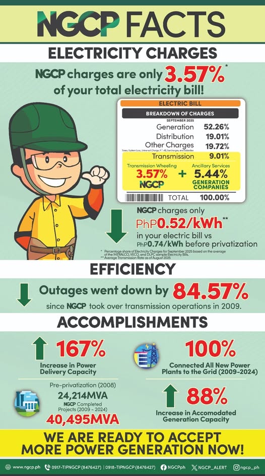 “For the October 2025 electric bill of the end consumers, NGCP charges only 59 centavos per kWh for the delivery of its services,” NGCP explained, adding that AS still accounts for the bulk