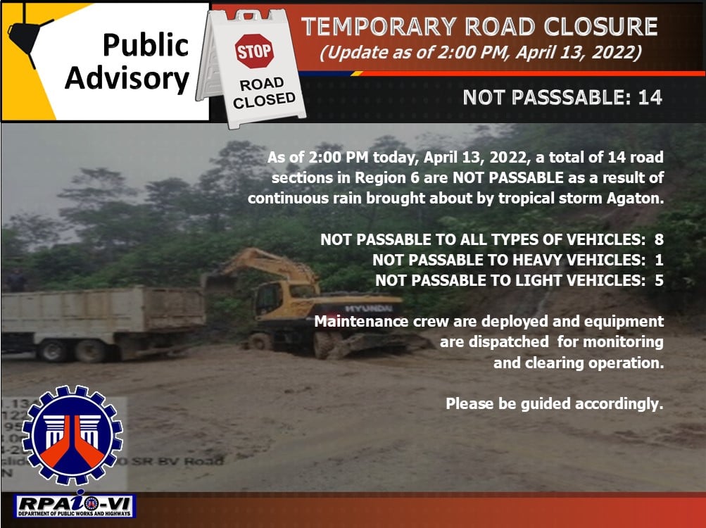 As of 2:00 PM today, April 13, 2022, a total of 14 road sections in Region 6 are NOT PASSABLE as a result of continuous rain brought about by tropical storm Agaton.